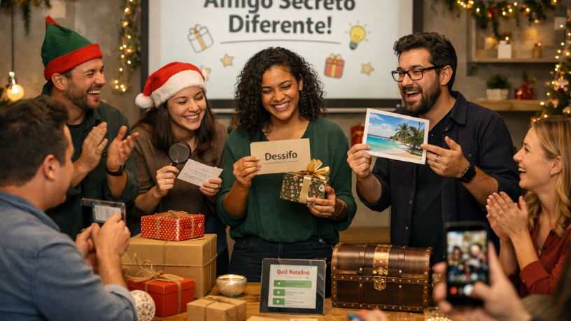 A criatividade também pode ser aplicada na forma como o sorteio e a revelação são conduzidos. Em vez de seguir o modelo tradicional, é possível introduzir elementos lúdicos que aumentem a expectativa e o envolvimento dos participantes. Dinâmicas interativas, como pistas, jogos ou pequenas performances, contribuem para tornar o momento mais divertido e menos formal. Esse tipo de abordagem é especialmente eficaz em grupos que valorizam descontração e integração.